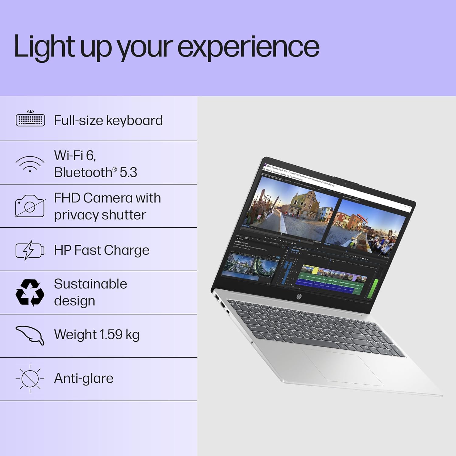 The 15.6-inch Full HD (FHD) display comes with micro-edge borders, giving you more screen space in a smaller frame. The Anti-Glare coating protects your eyes from strain, making it comfortable to work for long hours. Plus, its sleek Silver finish and lightweight design (only 1.59kg) make it very easy to carry in your bag.